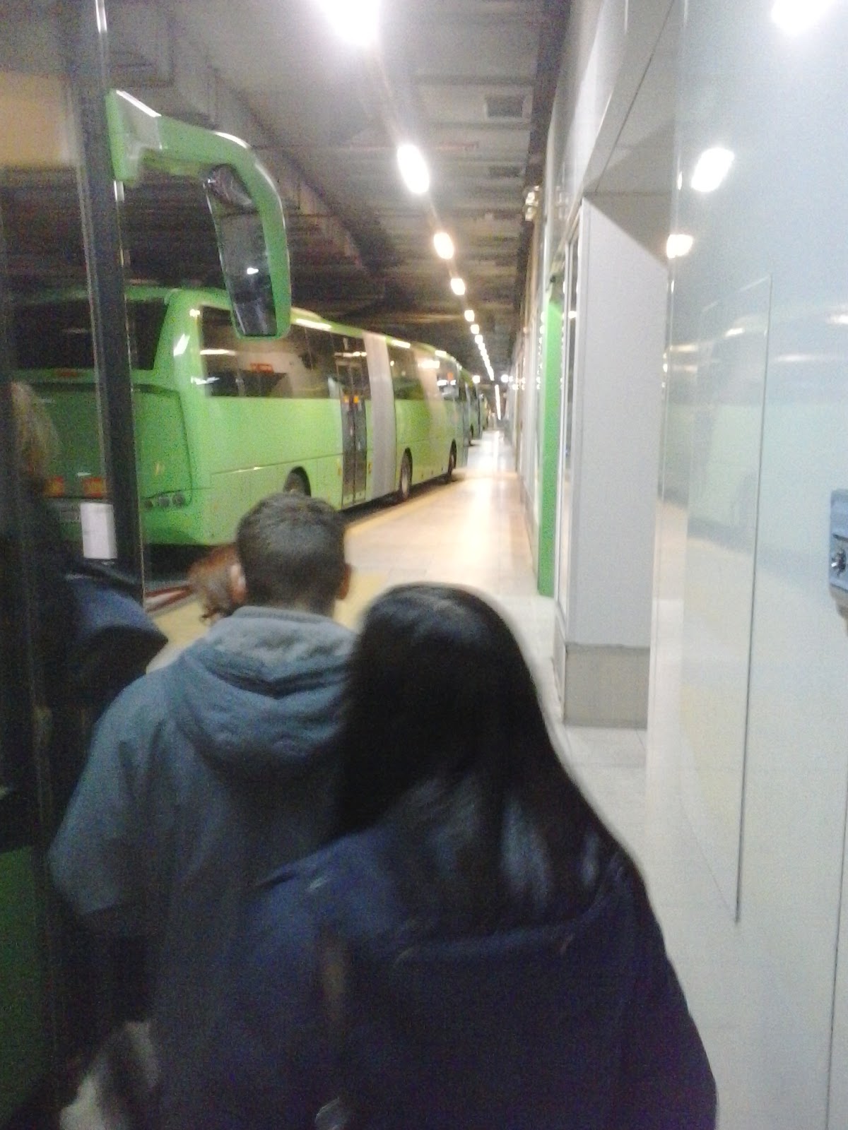 Veo en la ventamilla de atrás del autobús 27 sentada una chica con una bolsa doblada que pone Desde 1974 M(1o,44) Pza de Castilla